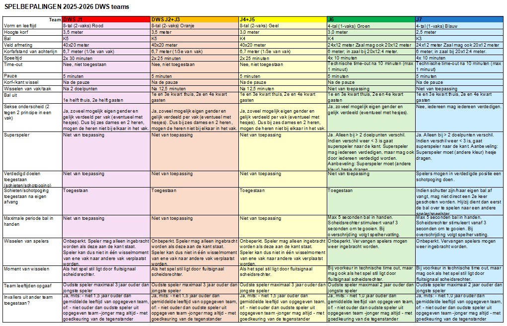 Voor de J1 t/m J7 jeugdteams van DWS is een schema beschikbaar waarin per kleurcategorie de spelbepalingen zijn uitgewerkt. Dit schema helpt trainers, scheidsrechters en ouders om de juiste regels toe te passen per team.